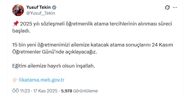 Tekin, "2025 yılı sözleşmeli öğretmenlik atama tercihlerinin alınması süreci başladı. 15 bin yeni öğretmenimizi ailemize katacak atama sonuçlarını 24 Kasım Öğretmenler Günü’nde açıklayacağız. Eğitim ailemize hayırlı olsun inşallah." ifadelerini kullandı.
