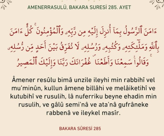 Amener rasulü bi ma ünzile ileyhi mir rabbihı vel mü'minun. Küllün amene billahi ve melaiketihı ve kütübihı ve rusülih. La nüferriku beyne ehadim mir rusülih ve kalu semı'na ve eta'na ğufraneke rabbena ve ileykel masıyr. La yükellifüllahü nefsen illa vüs'aha. Leha ma kesebet ve aleyha mektesebet. Rabbena la tüahızna in nesına ev ahta'na rabbena ve la tahmil aleyna ısran kema hameltehu alellezıne min kablina. Rabbena ve la tühammilna ma la takate lena bih. Va'fü anna, vağfir lena, verhamna ente mevlane fensurna alel kavmil kafirın.