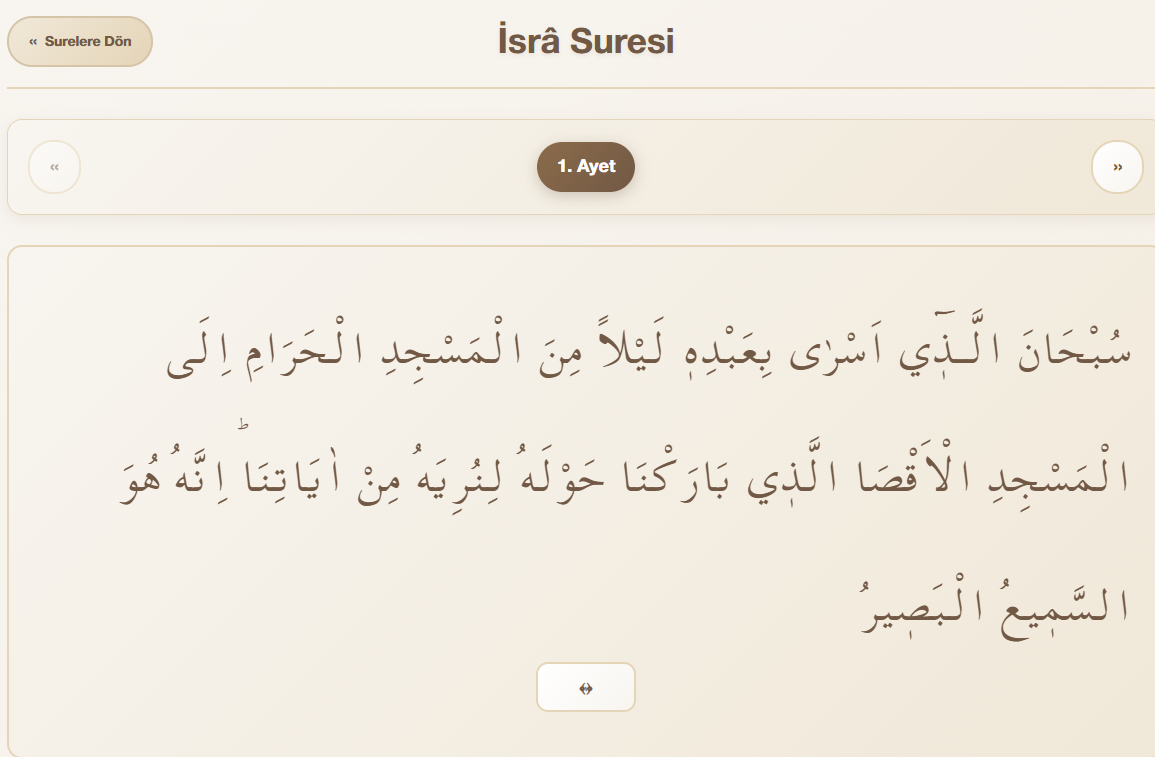 "Bir gece, kendisine bazı âyetlerimizi gösterelim diye kulunu Mescid-i Harâm'dan çevresini mübarek kıldığımız Mescid-i Aksâ'ya götüren Allah eksikliklerden münezzehtir. O, gerçekten her şeyi işitmekte ve görmektedir."