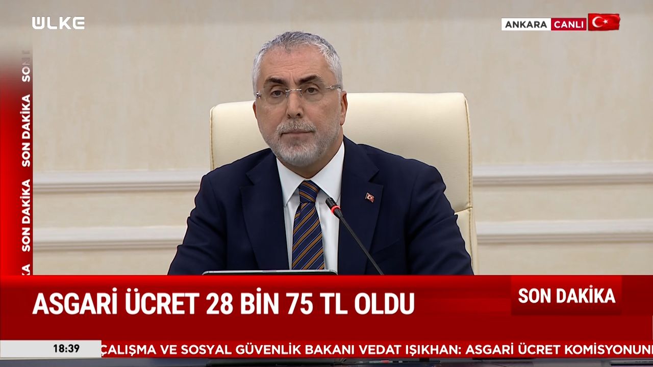 Ankara'da gerçekleştirilen Asgari Ücret Tespit Komisyonu'nun 3. toplantısının ardından kameralar karşısına geçen Çalışma ve Sosyal Güvenlik Bakanı Vedat Işıkhan, işçi ve işveren tarafıyla yürütülen görüşmeler sonucunda belirlenen yeni rakamları kamuoyuyla paylaştı.