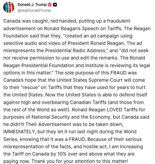 Ronald Reagan Vakfı ve Enstitüsü’nün, Kanada'nın eski ABD Başkanı Ronald Reagan'ın gümrük vergileri hakkında olumsuz konuştuğunu gösteren aldatıcı ve sahte bir reklam kullandığını tespit ettiğini hatırlatan Trump, "Kanada, Ronald Reagan’ın gümrük vergileri ile ilgili konuşmasını aldatıcı şekilde reklamda kullanırken suçüstü yakalandı" değerlendirmesinde bulundu.