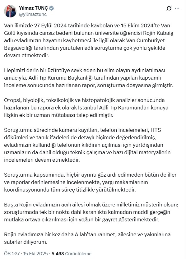 Sosyal medyadan paylaşımda bulunan Bakan Tunç, "Van ilimizde 27 Eylül 2024 tarihinde kaybolan ve 15 Ekim 2024’te Van Gölü kıyısında cansız bedeni bulunan üniversite öğrencisi Rojin Kabaiş adlı evladımızın hayatını kaybetmesi ile ilgili olarak Van Cumhuriyet Başsavcılığı tarafından yürütülen adli soruşturma çok yönlü şekilde devam etmektedir. Hepimizi derin bir üzüntüye sevk eden bu elim olayın aydınlatılması amacıyla, Adli Tıp Kurumu Başkanlığı tarafından yapılan kapsamlı inceleme sonucunda hazırlanan rapor, soruşturma dosyasına girmiştir." dedi.