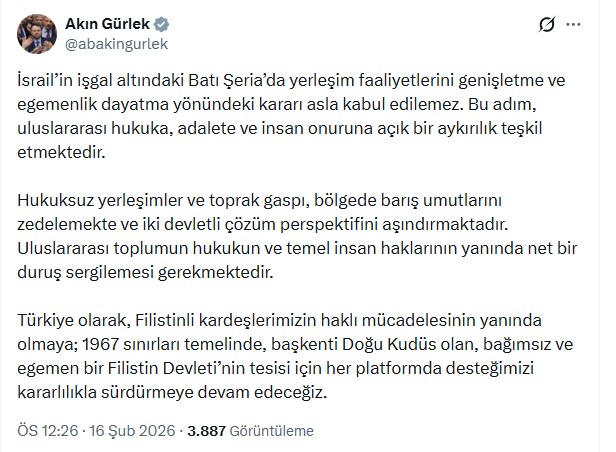 Bakan Gürlek, X hesabından yaptığı paylaşımda, İsrail’in işgal altındaki Batı Şeria’da yerleşim faaliyetlerini genişletme ve egemenlik dayatma yönündeki kararının kabul edilemez olduğunu ifade ederek, "Bu adım, uluslararası hukuka, adalete ve insan onuruna açık bir aykırılık teşkil etmektedir. Hukuksuz yerleşimler ve toprak gaspı, bölgede barış umutlarını zedelemekte ve iki devletli çözüm perspektifini aşındırmaktadır. Uluslararası toplumun hukukun ve temel insan haklarının yanında net bir duruş sergilemesi gerekmektedir" dedi.