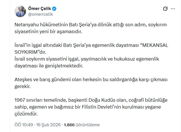 Çelik, sosyal medya hesabından yaptığı paylaşımda, "Netanyahu hükümetinin Batı Şeria'ya dönük attığı son adım, soykırım siyasetinin yeni bir aşamasıdır. İsrail'in işgal altındaki Batı Şeria'ya egemenlik dayatması 'mekansal soykırım'dır. İsrail soykırım siyasetini işgal, yayılmacılık ve hukuksuz egemenlik dayatması ile genişletmektedir. Ateşkes ve barış gündemi olan herkesin bu saldırganlığa karşı çıkması gerekir. 1967 sınırları temelinde, başkenti Doğu Kudüs olan, coğrafi bütünlüğe sahip, egemen ve bağımsız bir Filistin Devleti'nin kurulması yegane çözümdür" ifadelerini kullandı.