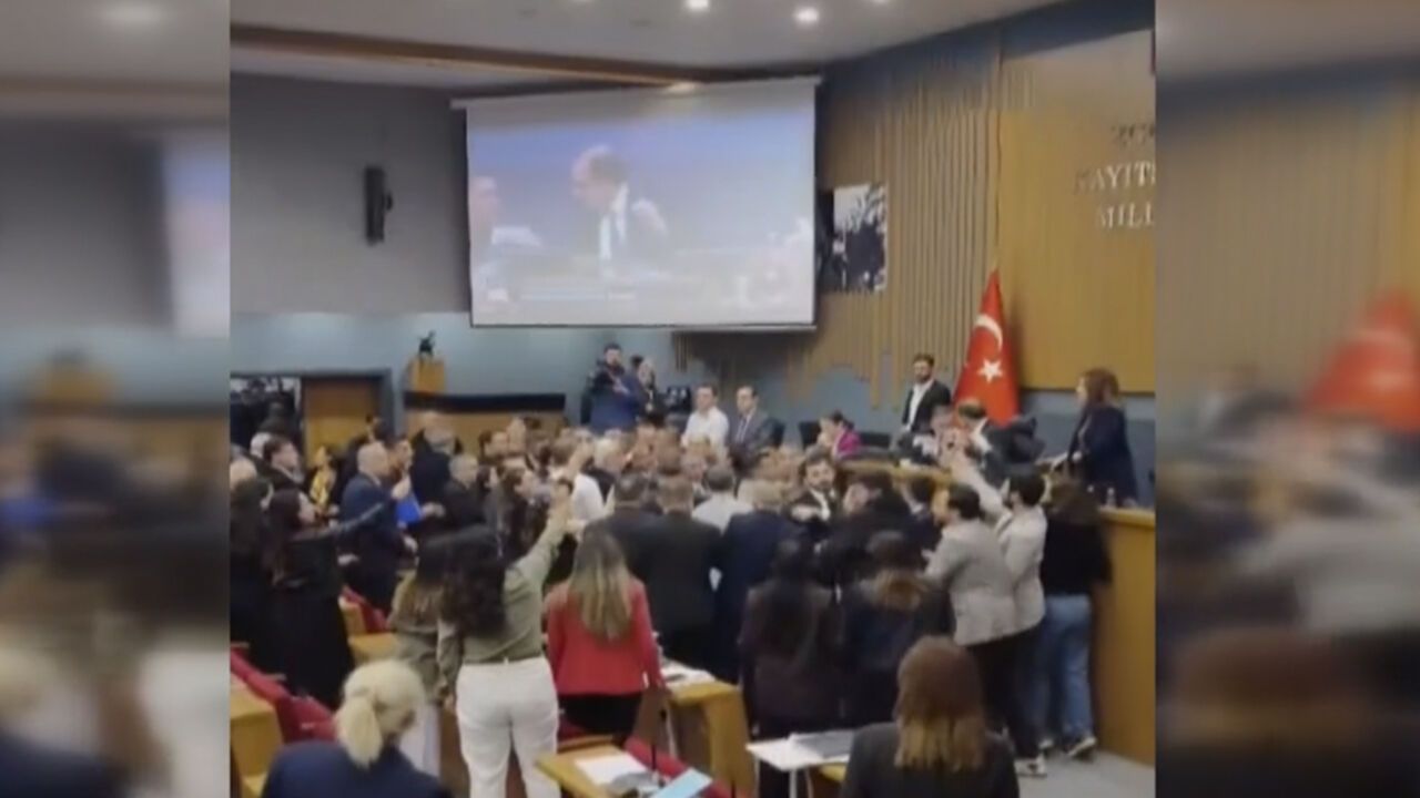 Bu sırada CHP ve AK Partili üyeler arasında gerginlik bir anda kavgaya dönüştü, meclis salonunda arbede çıktı.