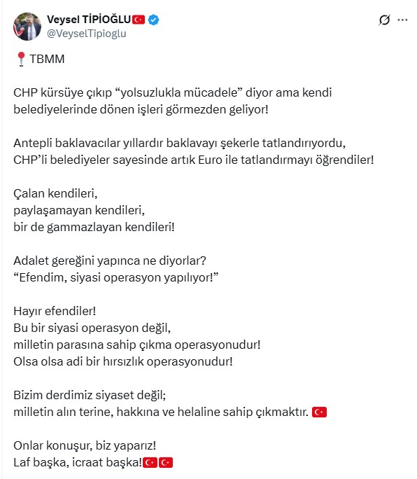 Sosyal medyadan da paylaşımda bulunan Tipioğlu, “CHP kürsüye çıkıp “yolsuzlukla mücadele” diyor ama kendi belediyelerinde dönen işleri görmezden geliyor. Antepli baklavacılar yıllardır baklavayı şekerle tatlandırıyordu. CHP’li belediyeler sayesinde artık euro ile tatlandırmayı öğrendiler” dedi.