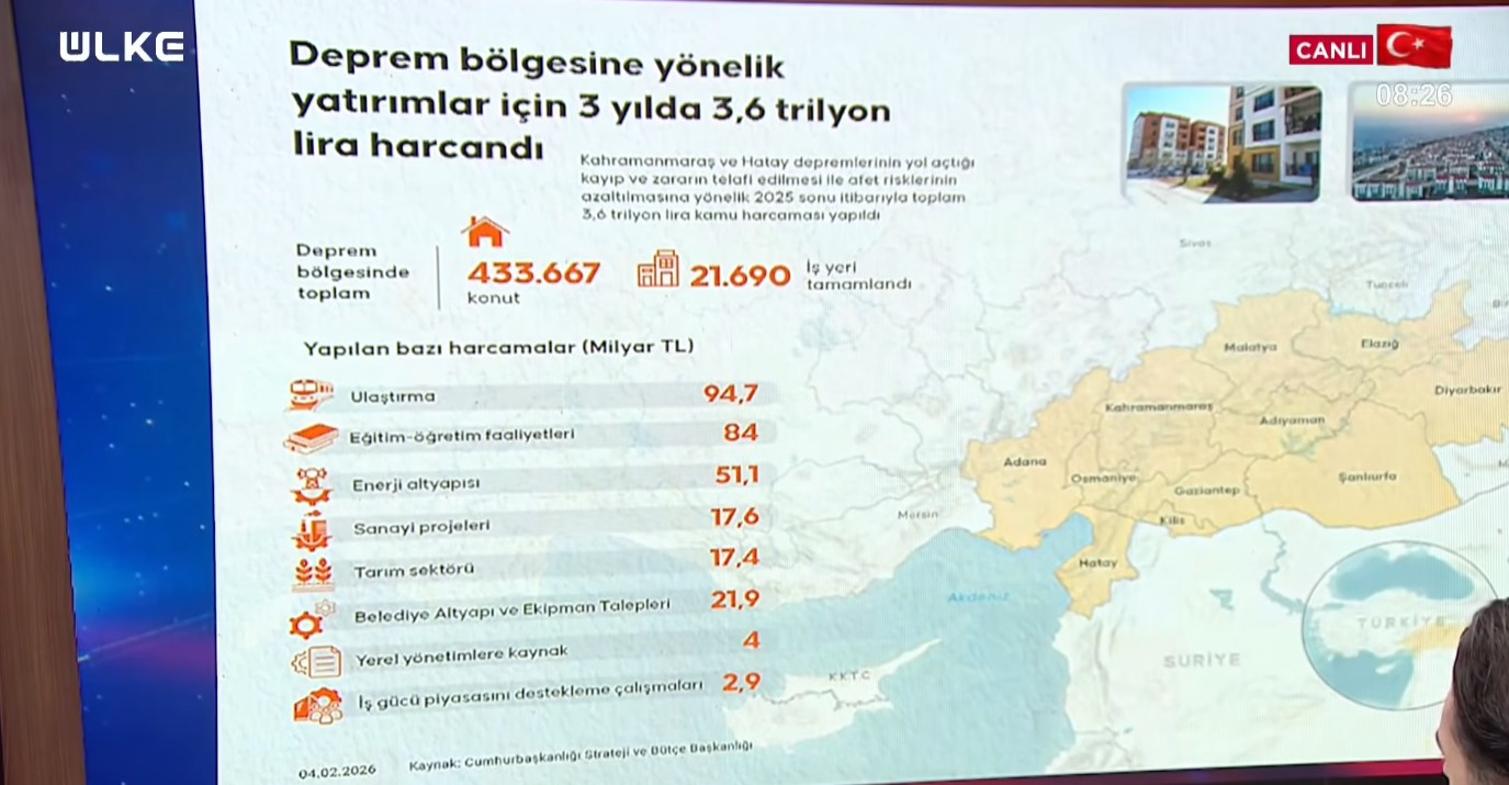 Rapora göre, Merkezi Yönetim Bütçesi kaynaklarından depremin yol açtığı kayıp ve zararın telafisi ile afet risklerinin azaltılmasına yönelik 2025 yılı sonu itibarıyla toplam 3,6 trilyon lira (yaklaşık 91,5 milyar dolar) harcama yapıldı.