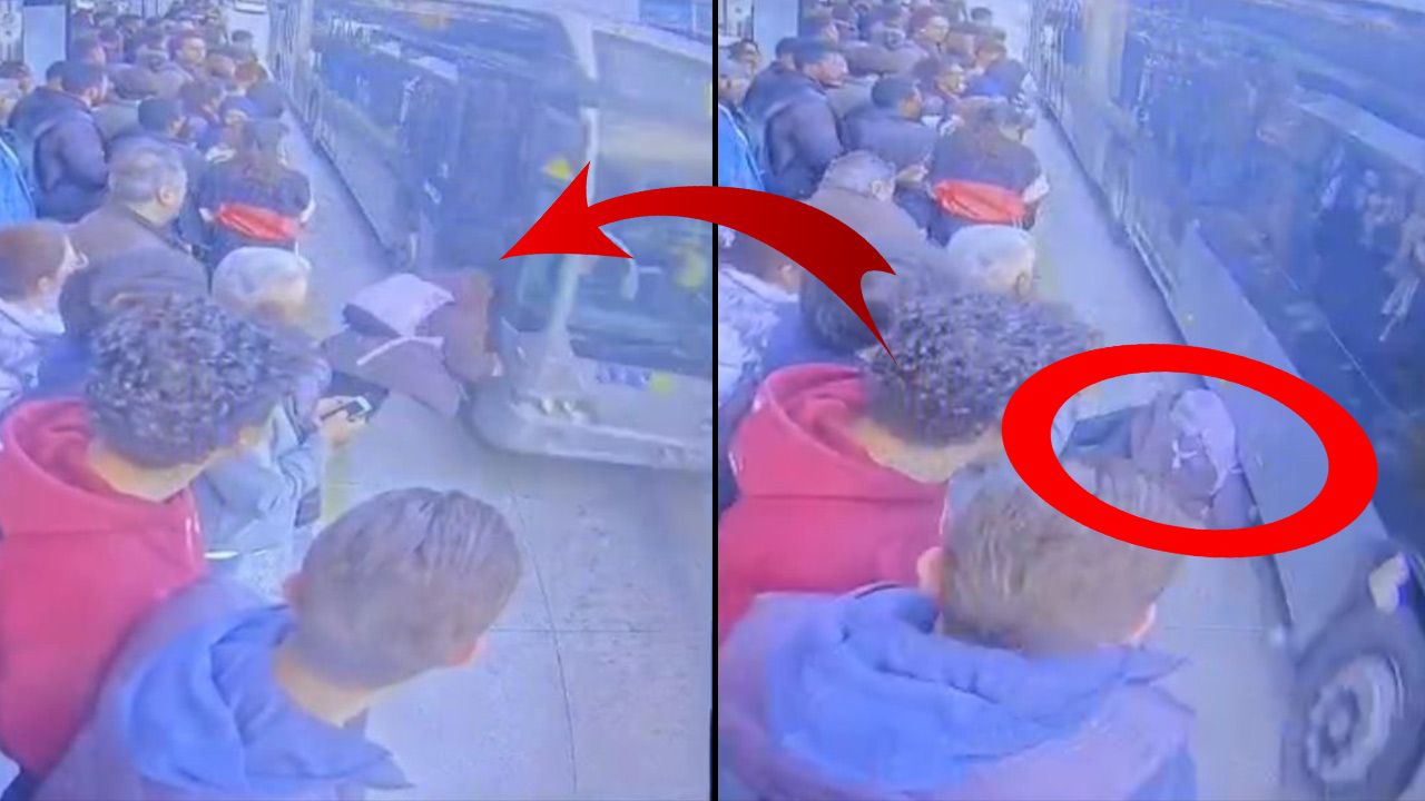 Görüntülerde, durakta bekleyen genç kız baygınlık geçirerek düşüyor ve metrobüs çarpıyor.