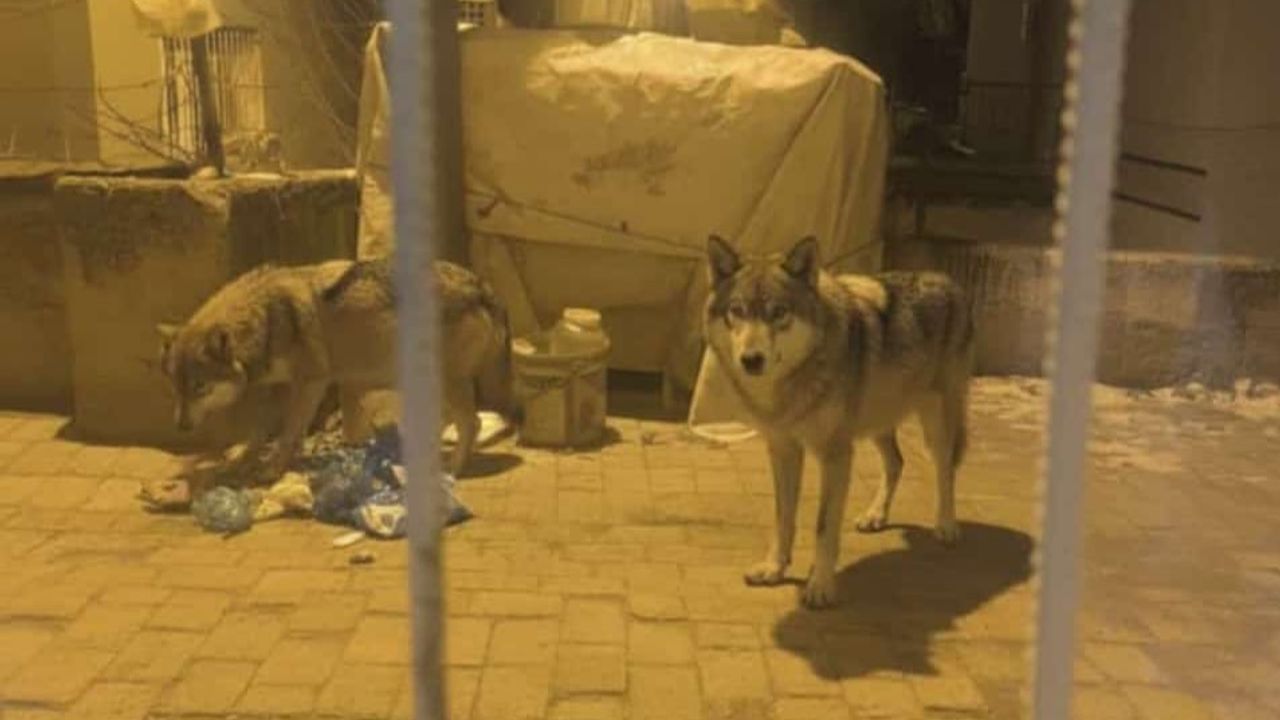 Aç kalan kurtlar, çöpleri karıştırarak yiyecek aradı.