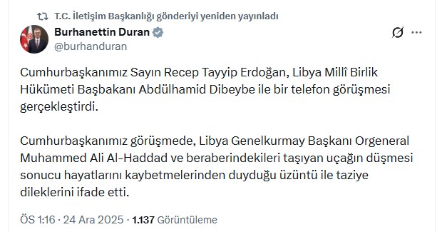 Cumhurbaşkanı Recep Tayyip Erdoğan, Libya Milli Birlik Hükümeti Başbakanı Abdülhamid Dibeybe ile bir telefon görüşmesi gerçekleştirdi.