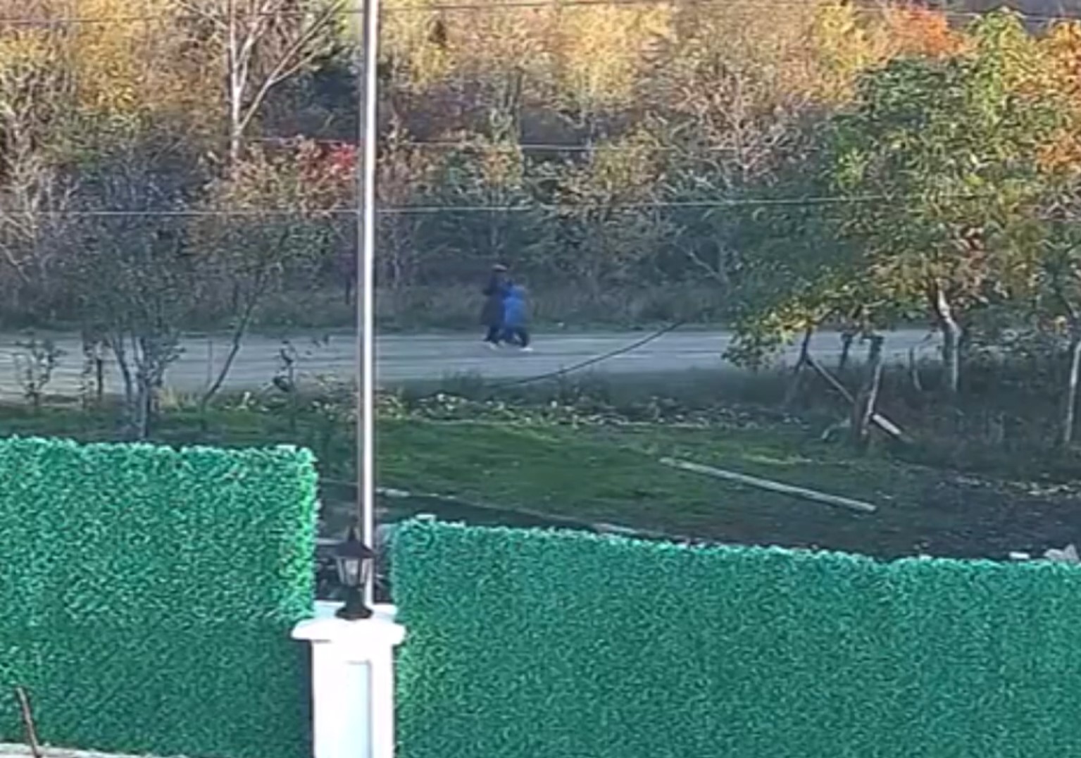 Anne ve oğlunun yol kenarından yavaş yavaş yürüdüğü, annenin sırtında bir çanta olduğu görülüyor.