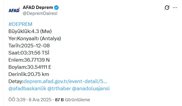 — AFAD Deprem (@DepremDairesi) December 8, 2025