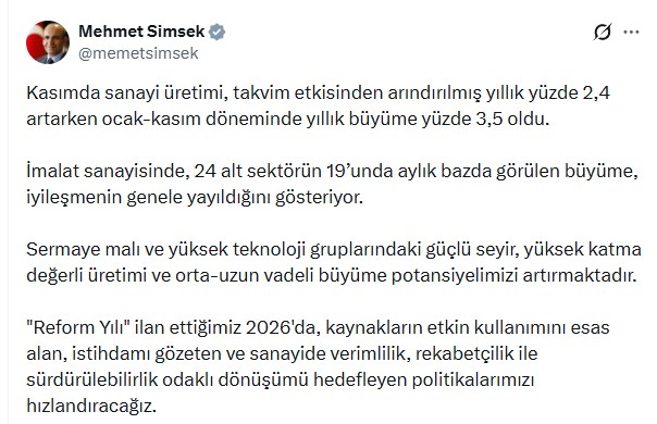 Şimşek, "İmalat sanayisinde 24 alt sektörün 19'unda aylık bazda görülen büyüme, iyileşmenin genele yayıldığını gösteriyor. Sermaye malı ve yüksek teknoloji gruplarındaki güçlü seyir, yüksek katma değerli üretimi ve orta-uzun vadeli büyüme potansiyelimizi artırmaktadır. Reform Yılı ilan ettiğimiz 2026'da kaynakların etkin kullanımını esas alan, istihdamı gözeten ve sanayide verimlilik, rekabetçilik ile sürdürülebilirlik odaklı dönüşümü hedefleyen politikalarımızı hızlandıracağız." ifadelerini kullandı.