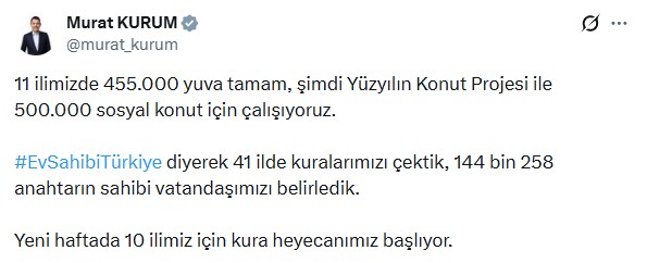 Bakan Kurum, sosyal medya hesabından 2-8 Şubat haftasının kura takvimini paylaşarak, "11 ilimizde 455 bin yuva tamam, şimdi Yüzyılın Konut Projesi ile 500 bin sosyal konut için çalışıyoruz. 'Ev Sahibi Türkiye' diyerek 41 ilde kuralarımızı çektik, 144 bin 258 anahtarın sahibi vatandaşımızı belirledik. Yeni haftada 10 ilimiz için kura heyecanımız başlıyor." ifadelerini kullandı.