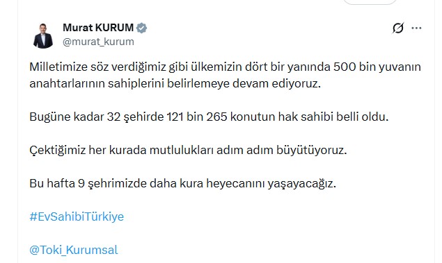 Sosyal medya hesabından 26-31 Ocak kura takvimini paylaşan Bakan Kurum, "Milletimize söz verdiğimiz gibi ülkemizin dört bir yanında 500 bin yuvanın anahtarlarının sahiplerini belirlemeye devam ediyoruz. Bugüne kadar 32 şehirde 121 bin 265 konutun hak sahibi belli oldu. Çektiğimiz her kurada mutlulukları adım adım büyütüyoruz. Bu hafta 9 şehrimizde daha kura heyecanını yaşayacağız" mesajını verdi.