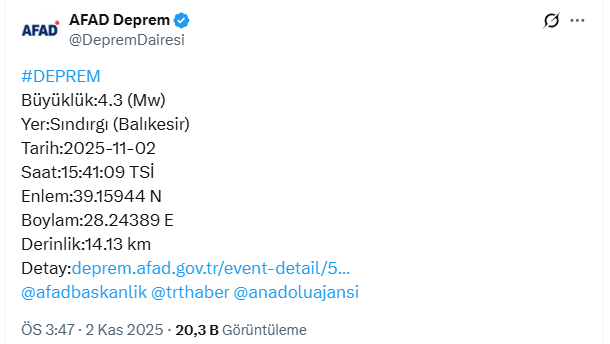 Afet ve Acil Durum Yönetimi Başkanlığı’nın (AFAD) verilerine göre, saat 15.41'de merkez üssü Balıkesir'in Sındırgı ilçesi olan 4.3 büyüklüğünde deprem oldu.