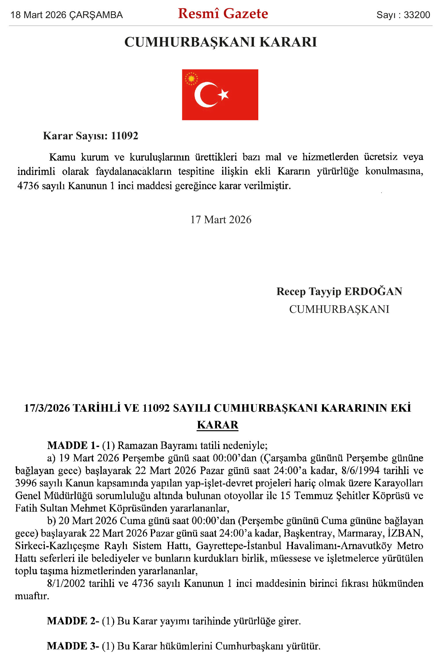 Cumhurbaşkanı Erdoğan'ın imzasıyla yayımlanan karar ile birlikte, 19 Mart Perşembe gününden 22 Mart Pazar gününe kadar, Başkentray, Marmaray, İZBAN, Sirkeci-Kazlıçeşme Raylı Sistem Hattı ile Gayrettepe-İstanbul Havalimanı-Arnavutköy Metro Hattı seferleri ücretsiz olacak.