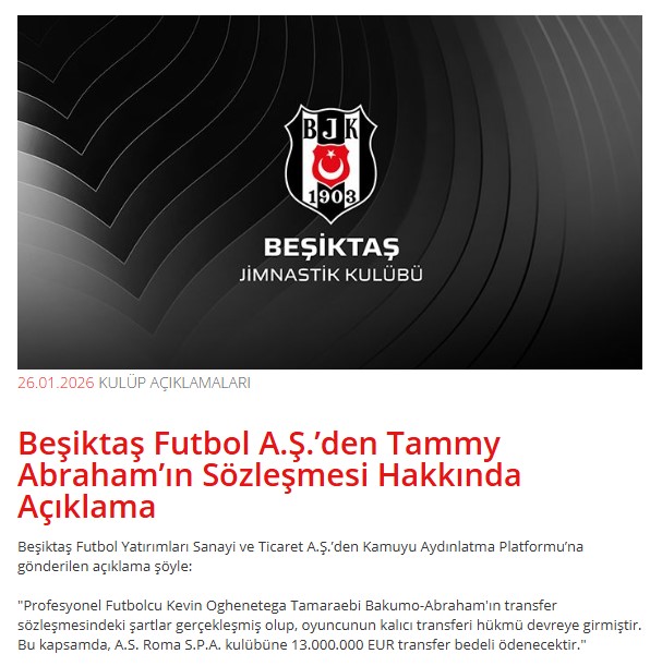 Beşiktaş Kulübü'nden yapılan son dakika açıklamasında "Profesyonel Futbolcu Kevin Oghenetega Tamaraebi Bakumo-Abraham'ın transfer sözleşmesindeki şartlar gerçekleşmiş olup, oyuncunun kalıcı transferi hükmü devreye girmiştir. Bu kapsamda, Roma kulübüne 13.000.000 EUR transfer bedeli ödenecektir." ifadeleri yer aldı.