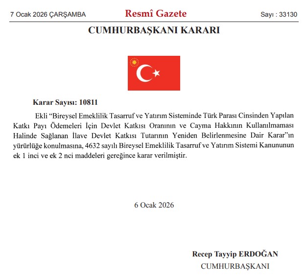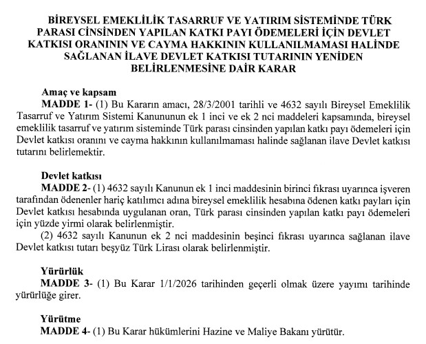 Kararla Bireysel Emeklilik Tasarruf ve Yatırım Sistemi'nde Türk lirası cinsinden yapılan katkı payı ödemeleri için devlet katkısı oranı ile cayma hakkının kullanılmaması halinde sağlanan ilave devlet katkı tutarı belirlendi.