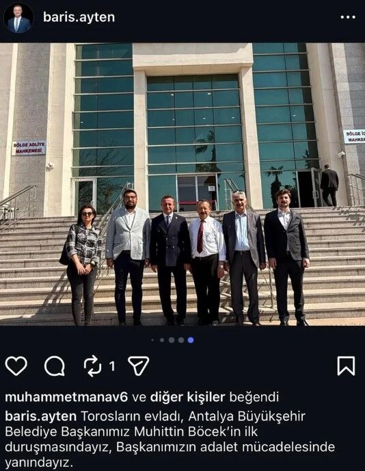 CHP Burdur İl Başkanı Barış Ayten'in paylaştığı fotoğrafta, "Torosların evladı, Antalya Büyükşehir Belediye Başkanımız Muhittin Böcek'in ilk duruşmasındayız, Başkanımızın adalet mücadelesinde yanındayız." ifadeleri yer aldı.