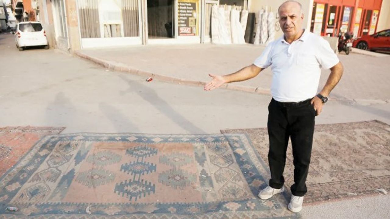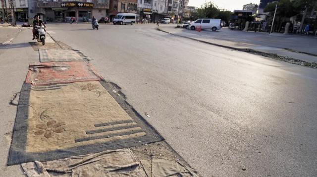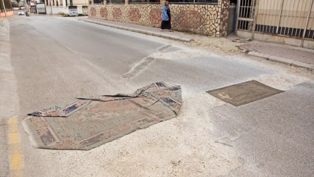 Vatandaşlar, bozuk ve tozlu yoldan korunmak için sokaklara halı serdi.