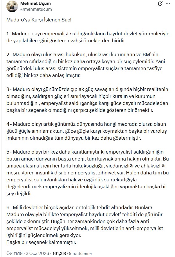 Sosyal medya hesabından açıklamada bulunan Uçum, Maduro'nun kaçırılmasının uluslararası hukukun, uluslararası kurumların ve Birleşmiş Milletler'in fiilen devre dışı bırakıldığını bir kez daha gözler önüne serdiğini söyledi.