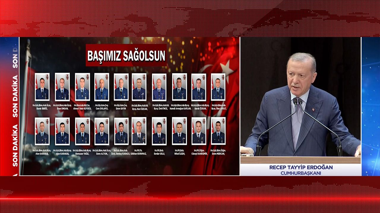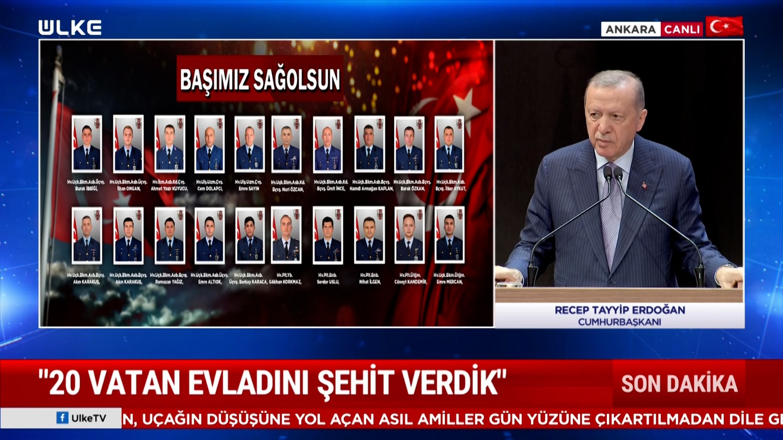 Cumhurbaşkanı Erdoğan şehitlerin isimlerini tek tek sayarak," Uçuş ekibinden Yarbay Gökhan Korkmaz’ı, Binbaşı Nihat İlgen’i, Binbaşı Serdar Uslu’yu, Üsteğmen Cüneyt Kandemir’i, Astsubay Kıdemli Başçavuş Nuri Özcan’ı, Astsubay Kıdemli Başçavuş Ümit İnce’yi, Astsubay Başçavuş Emrah Kuran’ı, Astsubay Başçavuş. Burak Özkan’ı, Astsubay Üstçavuş. Emre Altıok’u, Astsubay Üstçavuş Burak İbbiği’yi, Yolcu ekibinden Üsteğmen Emre Mercan’ı, Astsubay Başçavuş Ramazan Yağız’ı, Astsubay Başçavuş Hamdi Armağan Kaplan’ı, Astsubay Başçavuş İlker Aykut’u, Astsubay Başçavuş Akın Karakuş’u Astsubay Üstçavuş Berkay Karaca’yı, Astsubay Üstçavuş İlhan Ongan’ı, Astsubay Kıdemli Çavuş Ahmet Yasir Kuyucu’yı, Uzman Çavuş Cem Dolapci’yi, ve Uzman Çavuş Emre Sayın’ı rahmetle yad ediyorum.