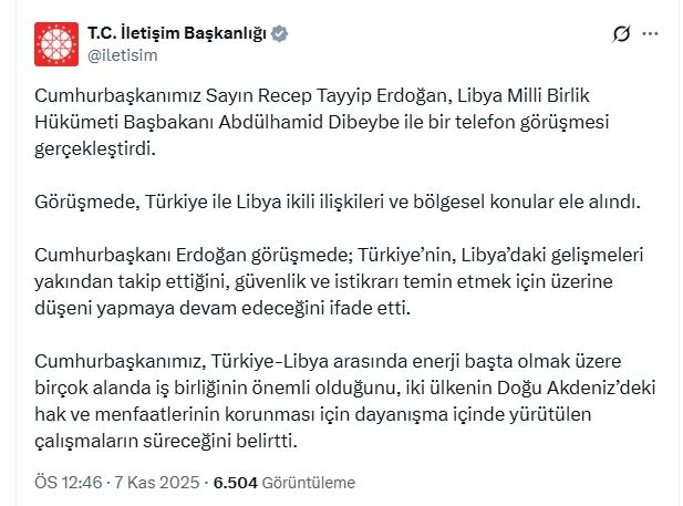 Görüşmede Erdoğan, Türkiye'nin, Libya'daki gelişmeleri yakından takip ettiğini, güvenlik ve istikrarı temin etmek için üzerine düşeni yapmaya devam edeceğini ifade etti.