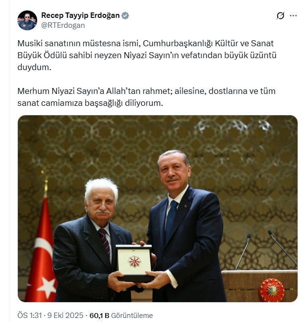 Erdoğan "Musiki sanatının müstesna ismi, Cumhurbaşkanlığı Kültür ve Sanat Büyük Ödülü sahibi neyzen Niyazi Sayın'ın vefatından büyük üzüntü duydum. Merhum Niyazi Sayın'a Allah'tan rahmet; ailesine, dostlarına ve tüm sanat camiamıza başsağlığı diliyorum" ifadelerini kullandı.