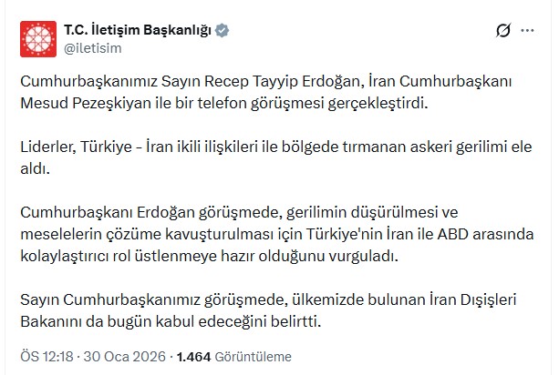 Cumhurbaşkanı Erdoğan, İran Cumhurbaşkanı Mesud Pezeşkiyan ile telefonla görüştü.