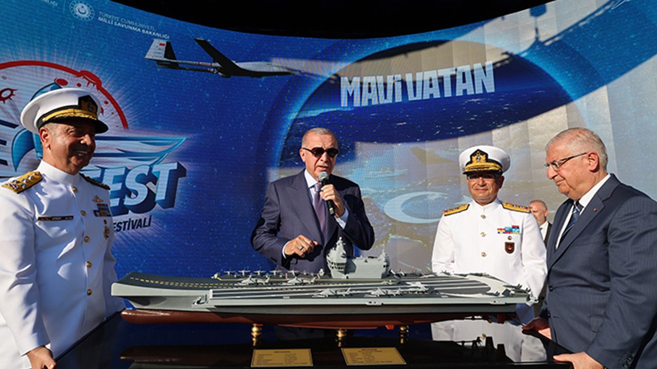 Törende Cumhurbaşkanı Erdoğan'a, Milli Savunma Bakanı Yaşar Güler ve Deniz Kuvvetleri Komutanı Oramiral Ercüment Tatlıoğlu tarafından milli uçak gemisinin maketi hediye edildi.