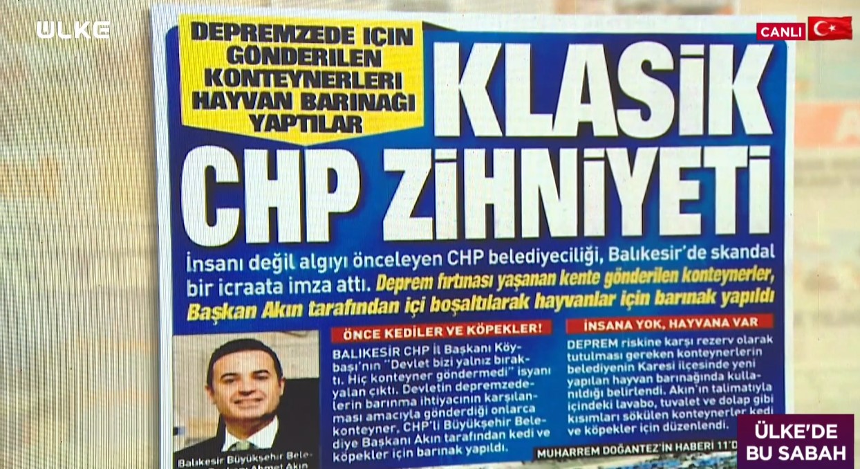 Sabah’ta yer alan habere göre, CHP devletin deprem riskine karşı barınma ihtiyacının karşılanması amacıyla kente gönderdiği deprem konteynerlerinin CHP'li Büyükşehir Belediye Başkanı Ahmet Akın tarafından amacı dışında kullanıldığı gün yüzüne çıktı.