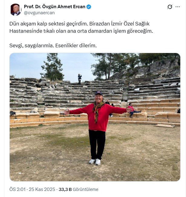 Ercan, "Dün akşam kalp sektesi geçirdim. Birazdan İzmir Özel Sağlık Hastanesi'nde tıkalı olan ana orta damardan işlem göreceğim" ifadelerine yer verdi.