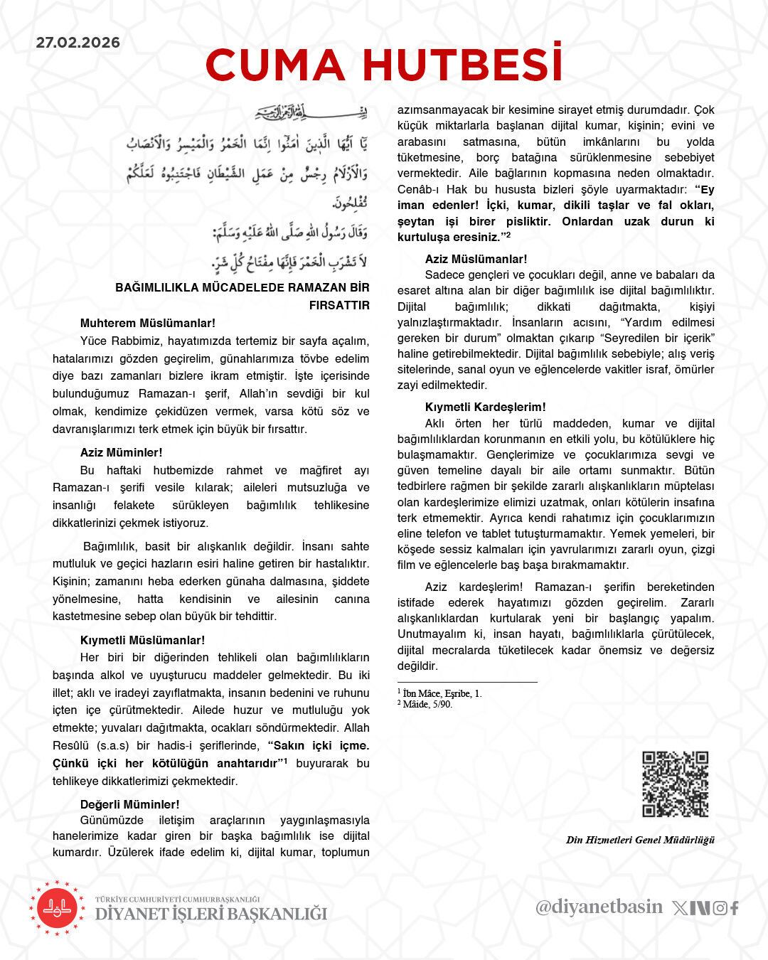 Diyanet İşleri Başkanlığı, 27 Şubat 2026 tarihli “Bağımlılıkla Mücadelede Ramazan Bir Fırsattır” başlıklı Cuma hutbesini yayımladı.
