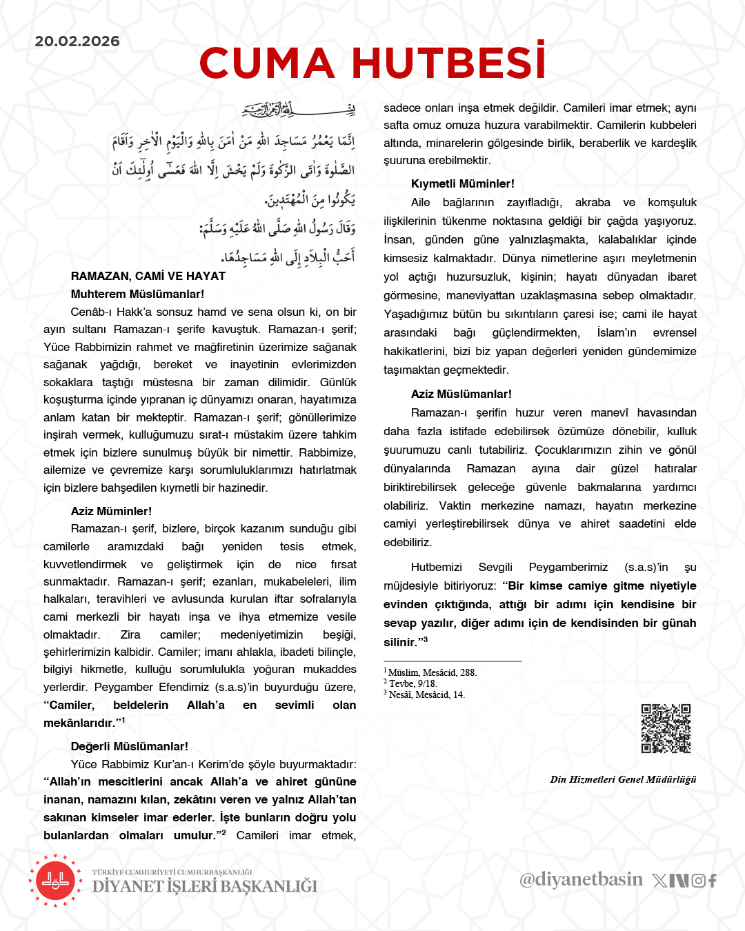 20 Şubat 2026 tarihli Cuma hutbesi, Diyanet İşleri Başkanlığı tarafından paylaşıldı.