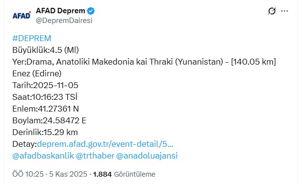 Afet ve Acil Durum Yönetimi Başkanlığı (AFAD) saat 10:16'da Edirne'de hissedilen 4.5 büyüklüğünde deprem olduğunu duyurdu.
