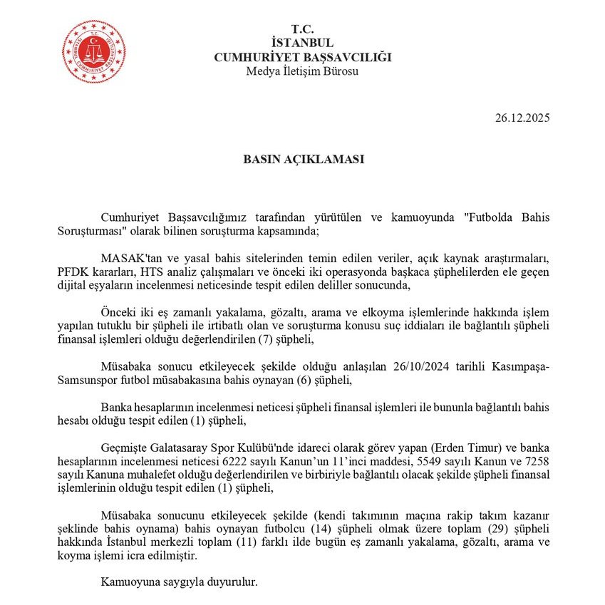 "Banka hesaplarının incelenmesi neticesi şüpheli finansal işlemleri ile bununla bağlantılı bahis hesabı olduğu tespit edilen 1 şüpheli, geçmişte Galatasaray Spor Kulübü'nde idareci olarak görev yapan (Erden Timur) ve banka hesaplarının incelenmesi neticesi 6222 sayılı Kanun'un 11'inci maddesi, 5549 sayılı Kanun ve 7258 sayılı Kanun'a muhalefet olduğu değerlendirilen ve birbiriyle bağlantılı olacak şekilde şüpheli finansal işlemlerinin olduğu tespit edilen 1 şüpheli, müsabaka sonucunu etkileyecek şekilde (kendi takımının maçına rakip takım kazanır şeklinde bahis oynama) bahis oynayan futbolcu 14 şüpheli olmak üzere toplam 29 şüpheli hakkında İstanbul merkezli 11 ilde bugün eş zamanlı yakalama, gözaltı, arama ve el koyma işlemi icra edilmiştir."