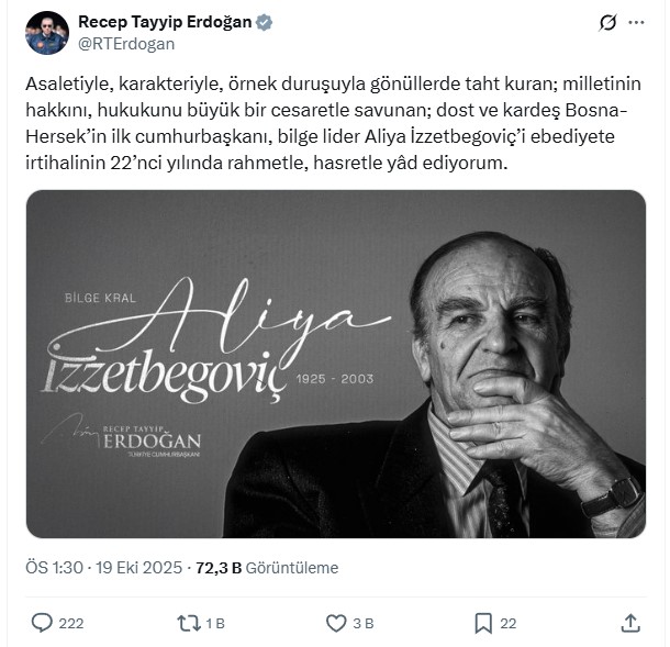 Cumhurbaşkanı Erdoğan, NSosyal hesabından yaptığı paylaşımda, "Asaletiyle, karakteriyle, örnek duruşuyla gönüllerde taht kuran, milletinin hakkını, hukukunu büyük bir cesaretle savunan, dost ve kardeş Bosna-Hersek'in ilk cumhurbaşkanı, bilge lider Aliya İzetbegoviç'i ebediyete irtihalinin 22. yılında rahmetle, hasretle yad ediyorum." ifadesini kullandı.