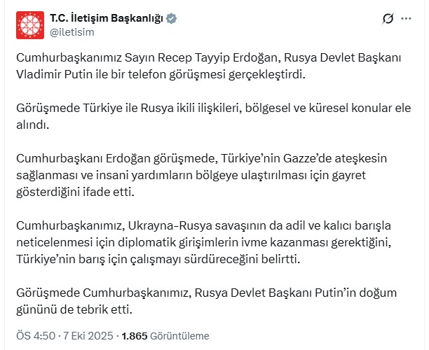 Görüşmede Erdoğan, Putin’in doğum gününü de tebrik etti.