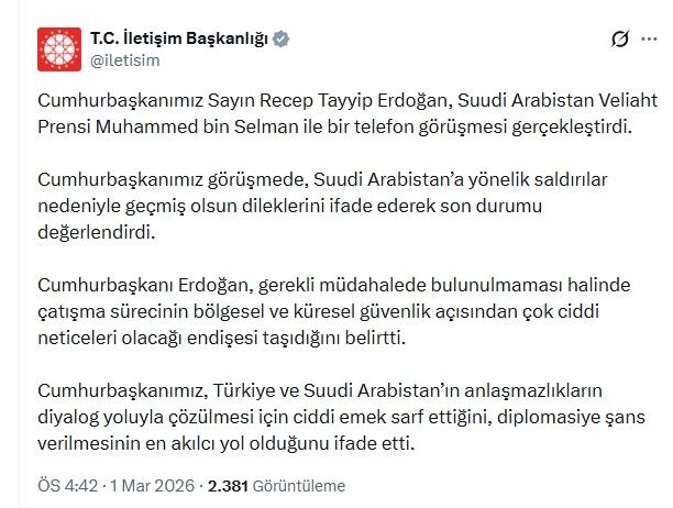 (1 Mart 2026 Pazar) Bugün ise Cumhurbaşkanı Recep Tayyip Erdoğan, Suudi Arabistan Veliaht Prensi Muhammed bin Selman ile bir telefon görüşmesi gerçekleştirdi.