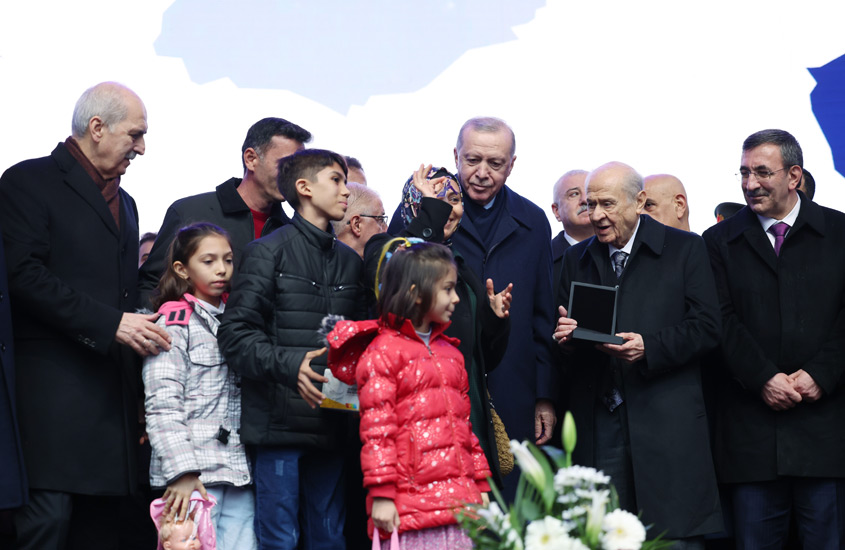 Maalesef böyle bir mesele bile ne yazık ki bunların gündemine gelmedi, burada da partizanca davrandılar. Peki, sonuçları ne oldu? Hepsinin hevesleri kursaklarında kaldı. İttifakımızın enkaz altında kalmasını bekleyenler büyük bir hayal kırıklığına uğradı. Bunların bizleri yıldırmayı, bizim irademizi kırmayı amaçlayan toksik siyasetine teslim olmadık. Biz bu işin altından kalkarız dedik ve hemen işe koyulduk. Sadece üç yıl gibi kısa sürede şehirlerimizi yeniden imar ve ihya ettik.