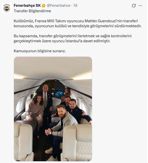 Fenerbahçe Kulübü yönetim kurulu üyeleri Taner Sönmezer, Ertan Torunoğulları ve sportif direktör Devin Özek'in Guendouzi ile özel uçakla İstanbul'a hareket ettiği fotoğraf da paylaşımda yer aldı.