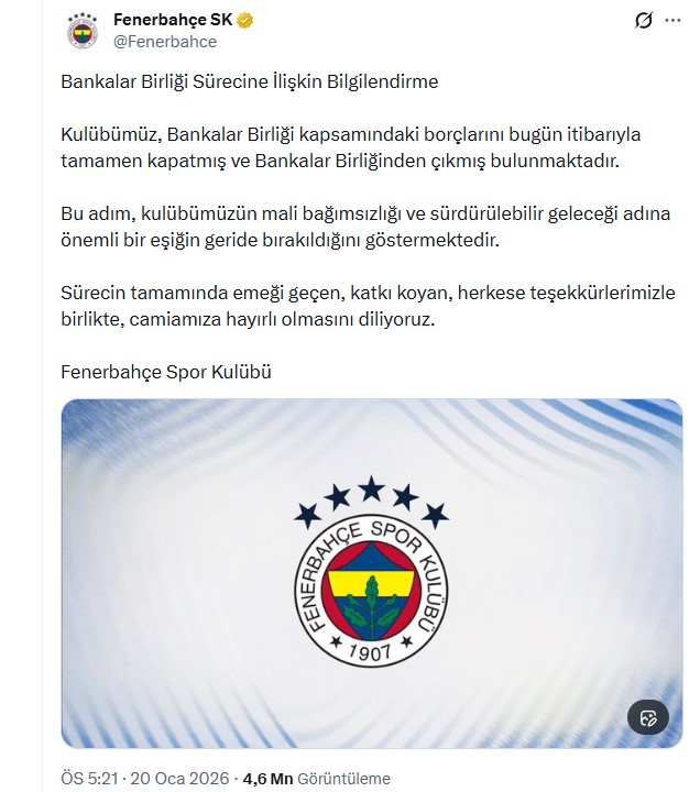 Sarı-lacivertli kulüpten konuya ilişkin yapılan açıklamada, "Kulübümüz, Bankalar Birliği kapsamındaki borçlarını bugün itibarıyla tamamen kapatmış ve Bankalar Birliği’nden çıkmış bulunmaktadır. Bu adım, kulübümüzün mali bağımsızlığı ve sürdürülebilir geleceği adına önemli bir eşiğin geride bırakıldığını göstermektedir. Sürecin tamamında emeği geçen, katkı koyan herkese teşekkürlerimizle birlikte, camiamıza hayırlı olmasını diliyoruz" denildi.