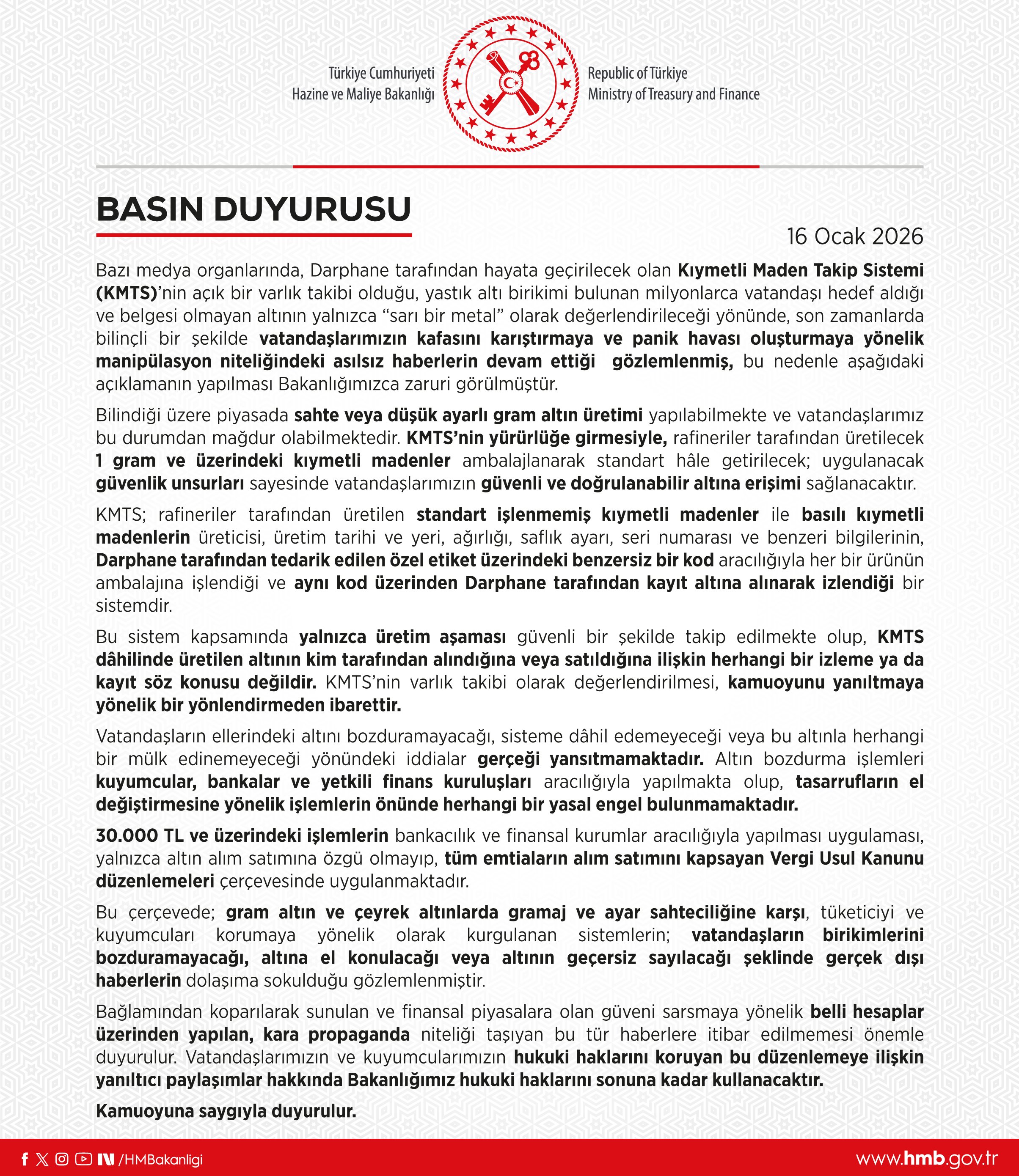 Hazine ve Maliye Bakanlığı'ndan yapılan açıklamada, son zamanlarda bazı medya organlarında, Darphane ve Damga Matbaası Genel Müdürlüğü tarafından hayata geçirilecek KMTS'nin,"açık bir varlık takibi olduğu", "yastık altı birikimi bulunan milyonlarca vatandaşı hedef aldığı" ve "belgesi olmayan altının yalnızca 'sarı bir metal' olarak değerlendirileceği" yönünde haberlerin yer aldığı belirtildi.