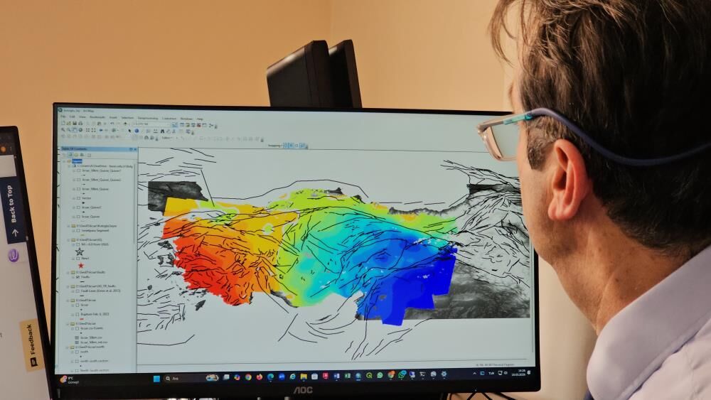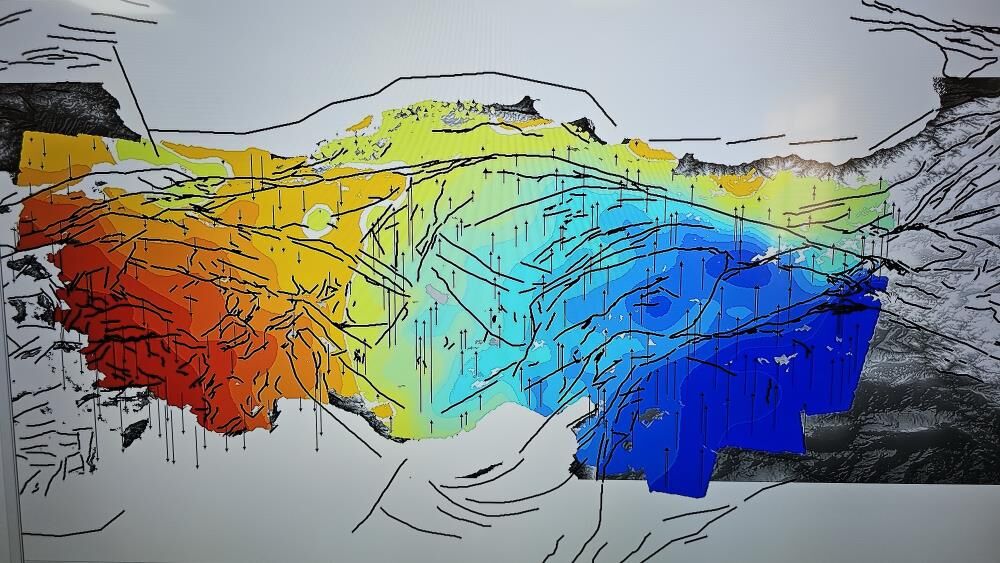 "Şimdi normalde Anadolu bloğunun doğudan Arap plakası, batıda Afrika plakasının sıkıştırmasıyla Ege denizine doğru böyle batıya doğru bir kaçış yaptığını biliyoruz zaten. İyi bilindiği üzere Anadolu bloğu, Türkiye'nin tamamını kapsayan Anadolu, Ege denizine doğru batıya doğru bir hareket yapıyor, bir kaçma hareketi yapıyor. Biz bu hareketi bileşenlerine ayırdık, kuzey ve doğuya yönlü hareketlerini ayrıştırdık. Bunun neticesinde karşımıza şöyle bir tablo çıktı.