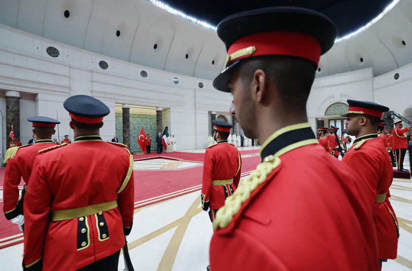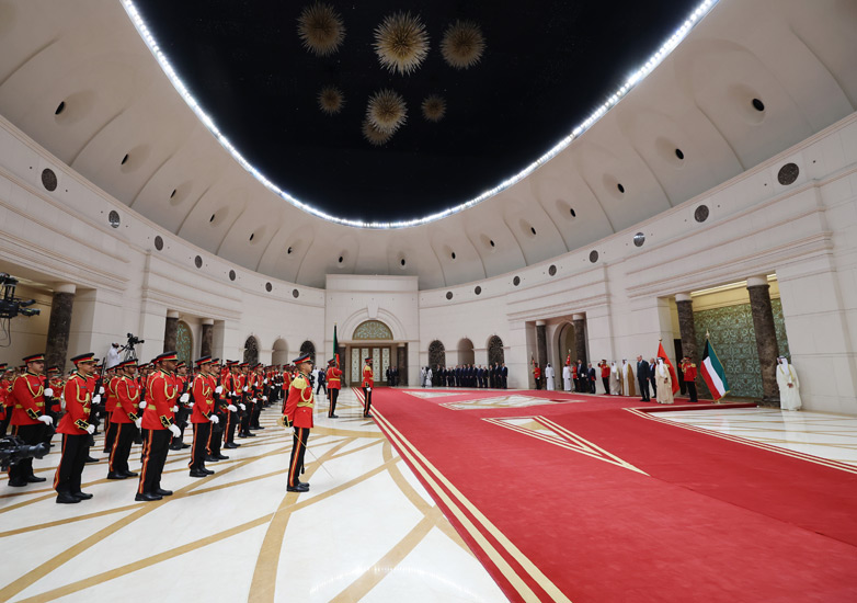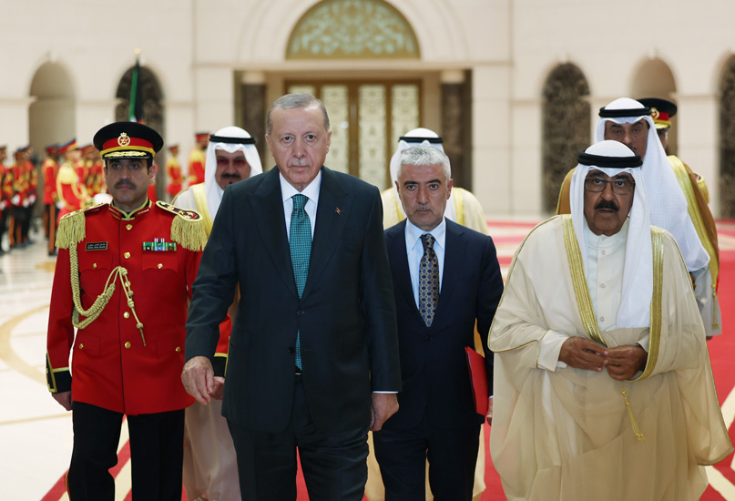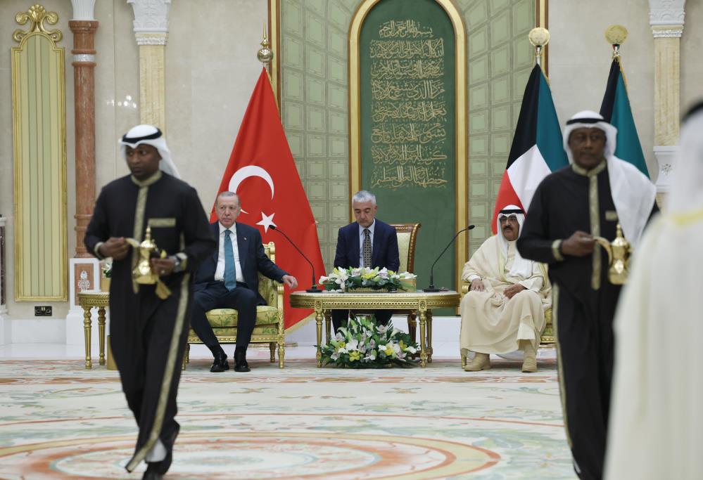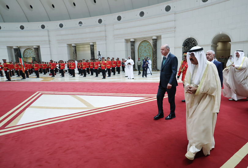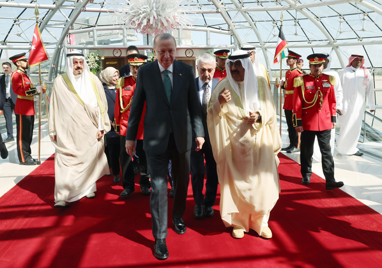 Cumhurbaşkanı Erdoğan, Kuveyt Uluslararası Havalimanı'na inişinde, Kuveyt Emiri Şeyh Mişal El Ahmed El Cabir El Sabah tarafından resmî törenle karşılandı.