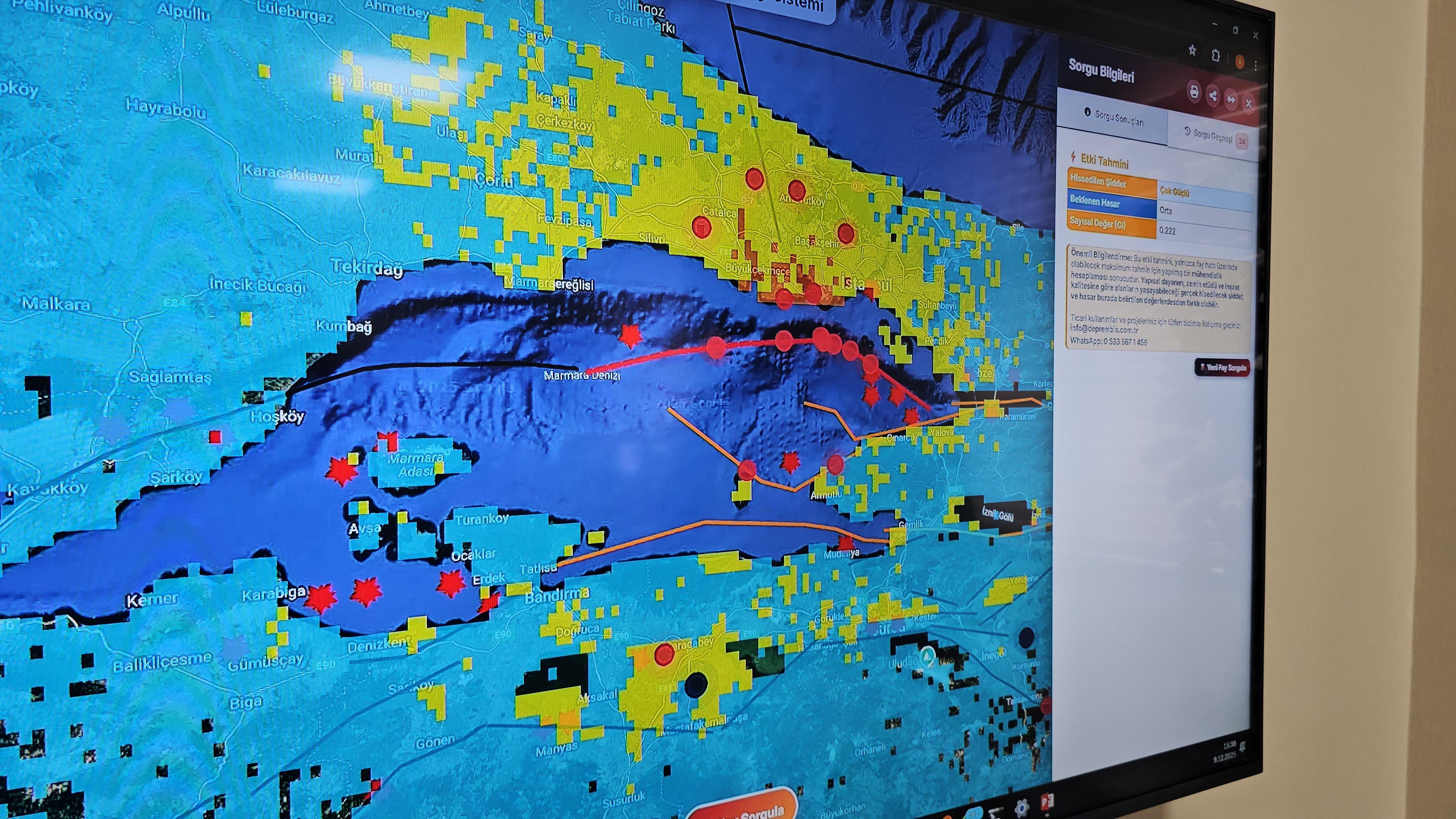 “Son dönemde çokça tartışma konusu olan Çınarcık Fayı adı verilen bu fayın kırılması durumunda beklenen hasar bölgesi hemen haritada karşınıza çıkıyor. Mavi alanlar, hafif hissedilen ve hasar beklenmeyen alanlar oluyor. Burada bir sarı noktayı seçtim. Burada depremin çok güçlü hissedileceğini ama hasarın orta seviyede olabileceğini öğrenebiliyoruz.
