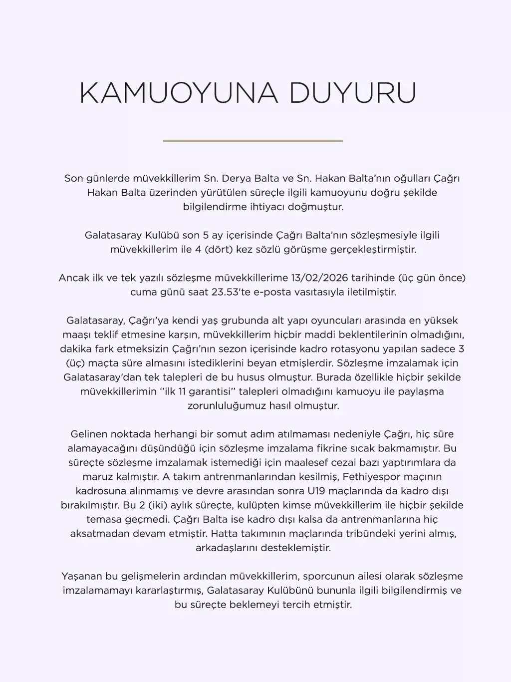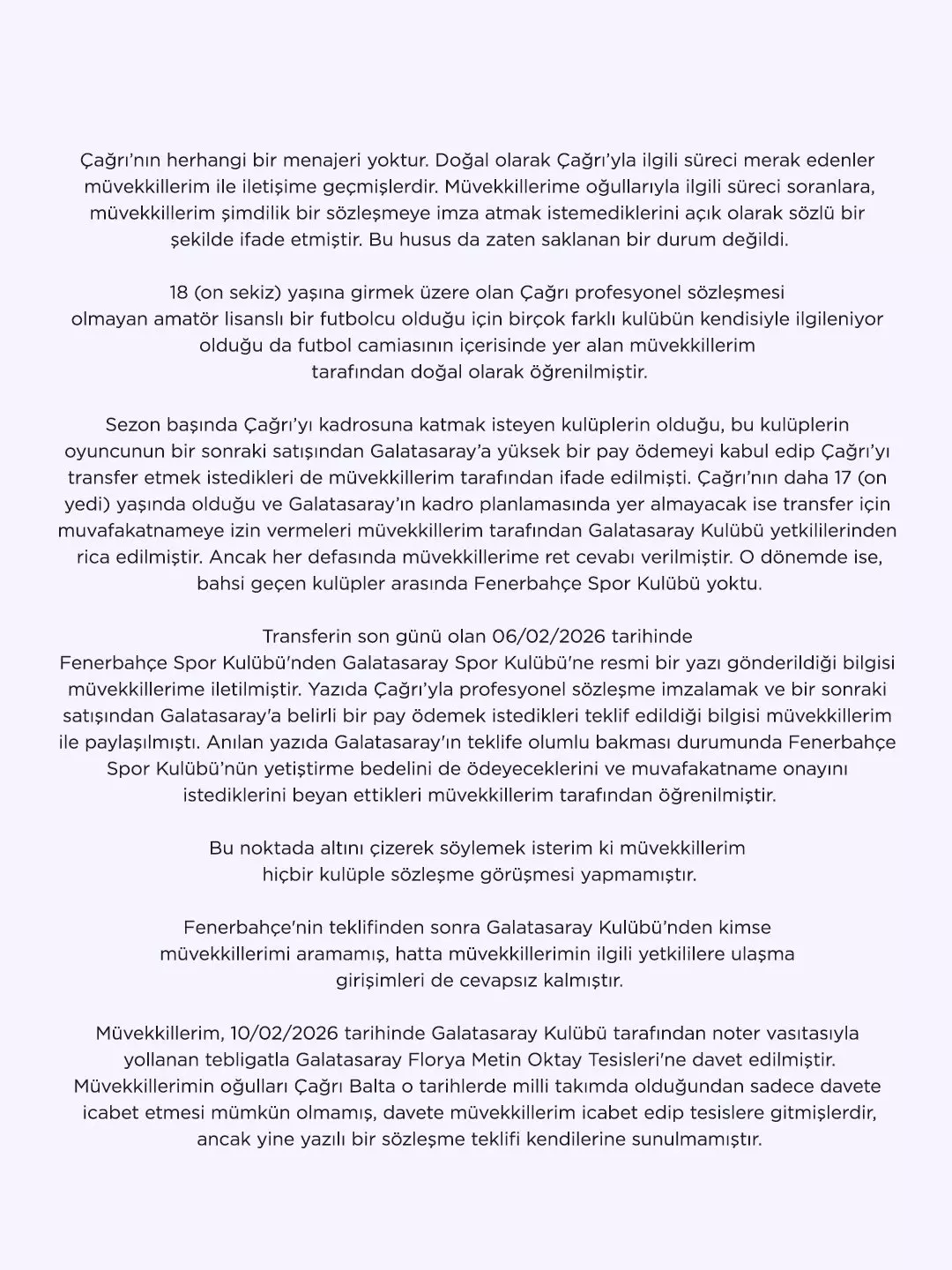 Avukatın açıklamasında şu çarpıcı ifadeler yer aldı: Bu 2 aylık süreçte, kulüpten kimse müvekkillerim ile hiçbir şekilde temasa geçmedi. Çağrı Balta ise kadro dışı kalsa da antrenmanlarına hiç aksatmadan devam etmiştir. Transferin son günü olan 06/02/2026 tarihinde Fenerbahçe Spor Kulübü'nden Galatasaray Spor Kulübü'ne resmi bir yazı gönderildiği bilgisi müvekkillerime iletilmiştir.