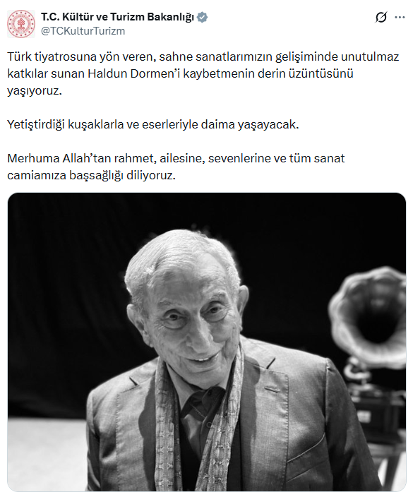 Kültür ve Turizm Bakanlığı sosyal medya hesabından yapılan başsağlığı mesajında, "Türk tiyatrosuna yön veren, sahne sanatlarımızın gelişiminde unutulmaz katkılar sunan Haldun Dormen’i kaybetmenin derin üzüntüsünü yaşıyoruz" ifadesi kullanıldı.