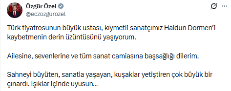 Özel, "Türk tiyatrosunun büyük ustası, kıymetli sanatçımız Haldun Dormen’i kaybetmenin derin üzüntüsünü yaşıyorum. Ailesine, sevenlerine ve tüm sanat camiasına başsağlığı dilerim.
